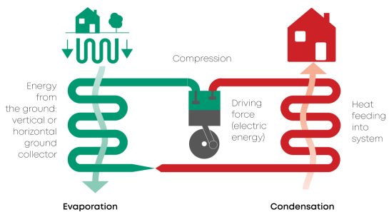 Varmen som hentes fra grunnen overføres deretter til bygget. Systemet oppnår en sesongbasert effektivitet som er opptil 5,5 ganger høyere enn for en konvensjonell elektrisk kjele.